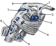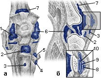 В области коленного сустава наиболее часто поражаются преднадколенниковые сумки — подкожная, подфасциальная и подсухожильная (рис. 4); с коленным суставом они не сообщаются. В связи с более поверхностным расположением подкожная сумка поражается наиболее часто. Воспаление сопровождается резким местным отеком, флюктуацией, повышением температуры, увеличением регионарных лимфотических узлов.