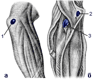 Острый бурсит нередко поражает лучеплечевую сумку, расположенную между бугристостью лучевой кости и сухожилием двуглавой мышцы (рис.3) (бурсит теннисистов).