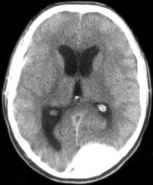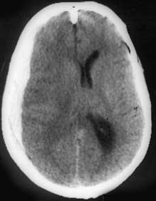 Внутричерепные кровоизлияния у пострадавших с выраженной анемией могут иметь плотность, одинаковую с плотностью мозга. Для сгустков крови характерна более высокая, чем для жидкой крови, плотность. Они четче дифференцируются от окружающих тканей. Внутричерепные гематомы, содержащие свежую несвернувшуюся кровь, на компьютерной томограмме могут иметь одинаковую с мозгом или даже пониженную плотность, на фоне которой при эпидуральной гематоме может выявляться оттеснение твердой мозговой оболочки.